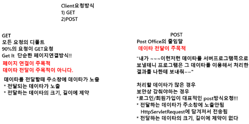 - 요청 처리 방식은 GET(단순 연결) vs POST(데이터 전달)
